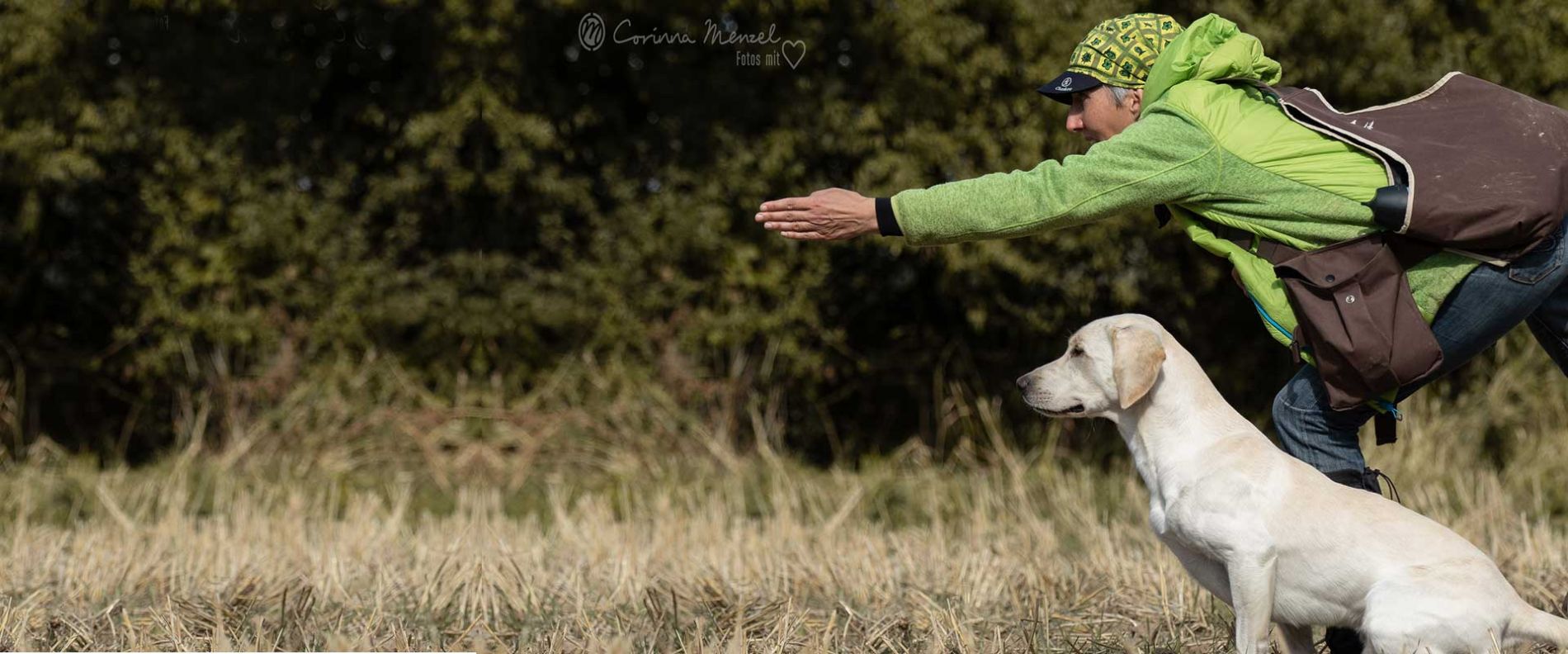 Jetzt hast du viel gelesen über ein oder zwei Kommandos und ich gehe noch einen Schritt weiter. Am Ende gibt es in meiner Ausbildung sogar 3 Kommandos. Hast du es bemerkt? Ich habe ein Kommando für voran, also das Blind (Siehe Bild mit Garvin und Carron, die oberen beiden). Darf mein Hund unmittelbar eine Markierung arbeiten, nehme ich den Apport-Befehl. Gibt es eine Doppelmarkierung oder liegt die Markierung längere Zeit, nehme ich die Hand und zeige mit einem Finger, wohin mein Hund gehen soll (Siehe Bild Carron unten). Das Kommando ist aber das Apport-Kommando. Und jetzt kommt das absolute Plus für die, die so ausbilden, dass der Hund am Ende mit den beiden Kommandos nicht in Konflikt steht: